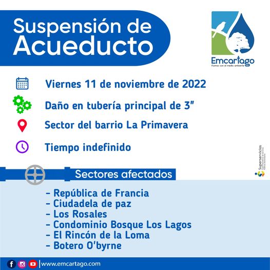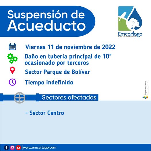 11 noviembre, 2022Publicado por Enlaza en 11 noviembre, 2022Categorías Boletines Suspensiones de Acueducto Suspensiones del ServicioSUSPENSION ACUEDUCTODaño ocasionado en el sector de la obra del Parque de Bolívar, ocasionado por terceros.