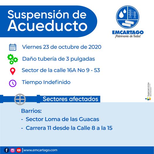 23 octubre, 2020Publicado por Enlaza en 23 octubre, 2020Categorías Cápsulas Informátivas Suspensiones de Acueducto Suspensiones del ServicioSUSPENSION ACUEDUCTOSuspensión del servicio de acueducto por daño en el sector de la calle16A No 9 – 53, Loma […]