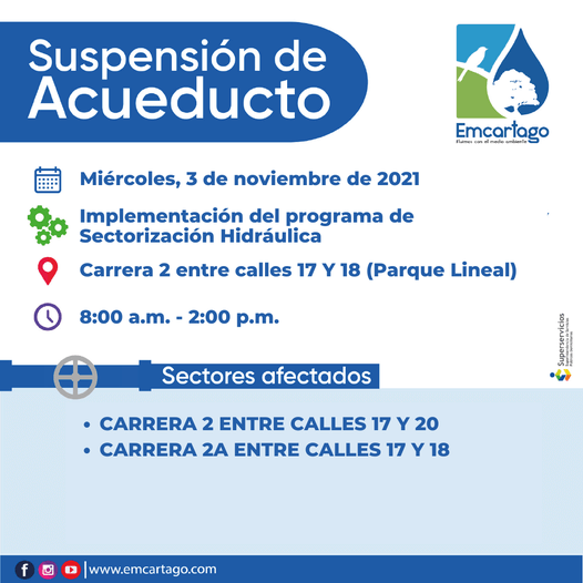 2 noviembre, 2021Publicado por Enlaza en 2 noviembre, 2021Categorías Boletines Cápsulas Informátivas Suspensiones de Acueducto Suspensiones del ServicioSUSPENSION ACUEDUCTO#SuspensiónDeAcueducto Este miércoles 3 de noviembre se efectuará una suspensión de acueducto en algunos sectores de la ciudad […]