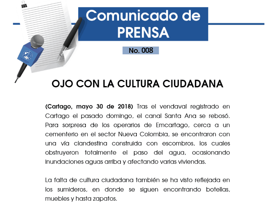 30 mayo, 2018Publicado por Publicador Noticias EMC en 30 mayo, 2018Categorías Comunicados de PrensaBOLETÍN N° 007 – 30 de mayo de 2018OJO CON LA CULTURA CIUDADANA Tras el vendaval registrado en Cartago el pasado domingo, el canal Santa Ana […]