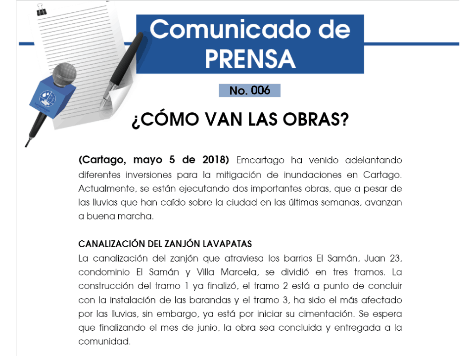 5 mayo, 2018Publicado por Publicador Noticias EMC en 5 mayo, 2018Categorías Comunicados de PrensaBOLETÍN N° 006 – 05 de mayo de 2018.¿CÓMO VAN LAS OBRAS? Emcartago ha venido adelantando diferentes inversiones para la mitigación de inundaciones en Cartago. Actualmente, […]