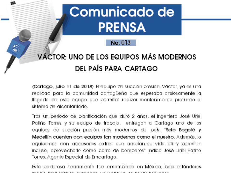 11 julio, 2018Publicado por Publicador Noticias EMC en 11 julio, 2018Categorías Comunicados de PrensaBOLETÍN N° 013 – 11 de julio de 2018VÁCTOR: UNO DE LOS EQUIPOS MÁS MODERNOS DEL PAÍS PARA CARTAGO El equipo de succión presión, Váctor, ya […]