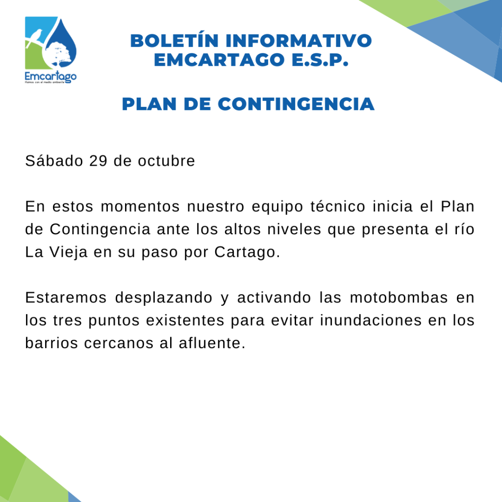 29 octubre, 2022Publicado por Publicador Noticias EMC en 29 octubre, 2022Categorías Boletines Cápsulas Informátivas Comunicados de PrensaBoletín Plan de contingenciaEmcartago empieza a desplazar a su equipo técnico para activar el Plan de Contingencia.