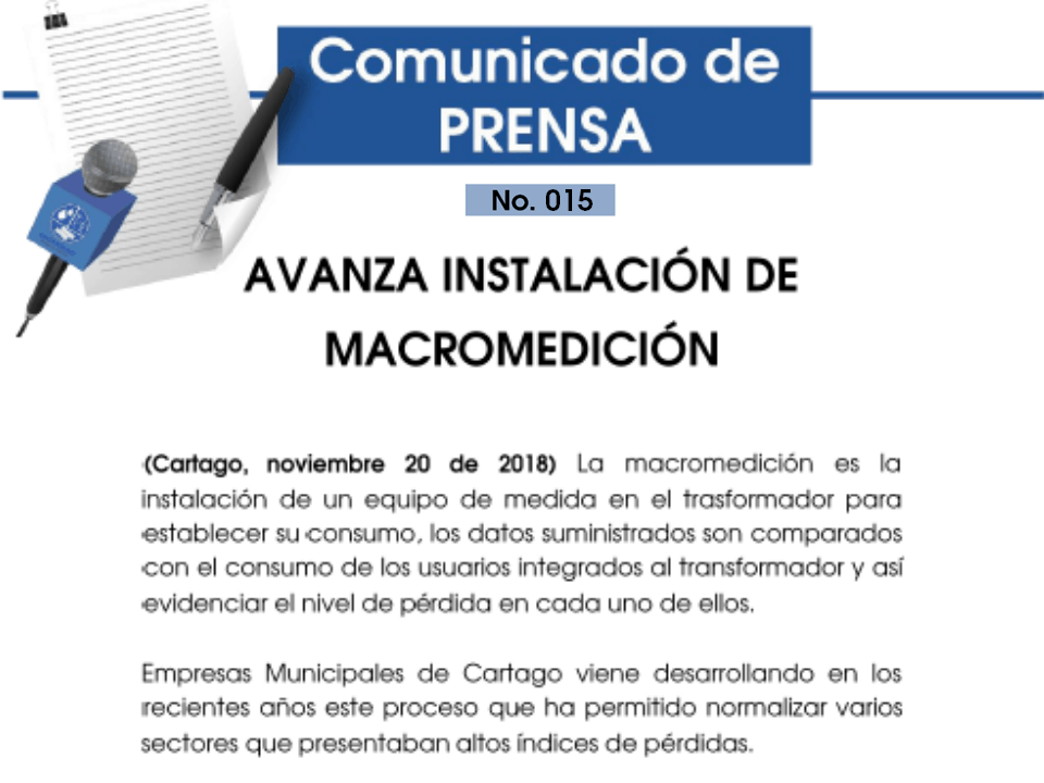 20 noviembre, 2018Publicado por Publicador Noticias EMC en 20 noviembre, 2018Categorías Comunicados de PrensaBOLETÍN N° 015 – 20 de noviembre de 2018AVANZA INSTALACIÓN DE MACROMEDICIÓN La macromedición es la instalación de un equipo de medida en el trasformador para […]