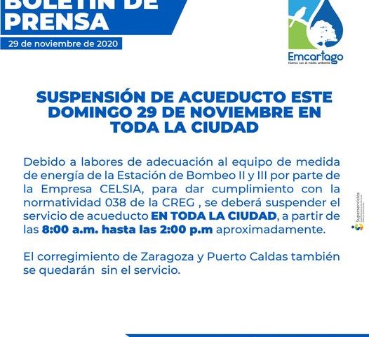 Suspensión de acueducto este domingo 29 de noviembre EN TODA LA CIUDAD de 8:00 A.M A 2:00 P.M., debido a labores de adecuación al equipo de medida de energía de la Estación de Bombeo II y III.