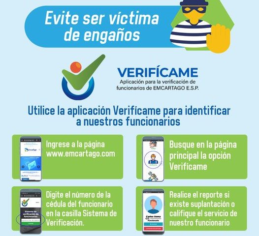 #Emcartago tiene a disposición de nuestros usuarios la aplicación Verifícame, con ella pueden identificar a los funcionarios que prestan el servicio en los diferentes sectores de la ciudad y así evitar suplantaciones.