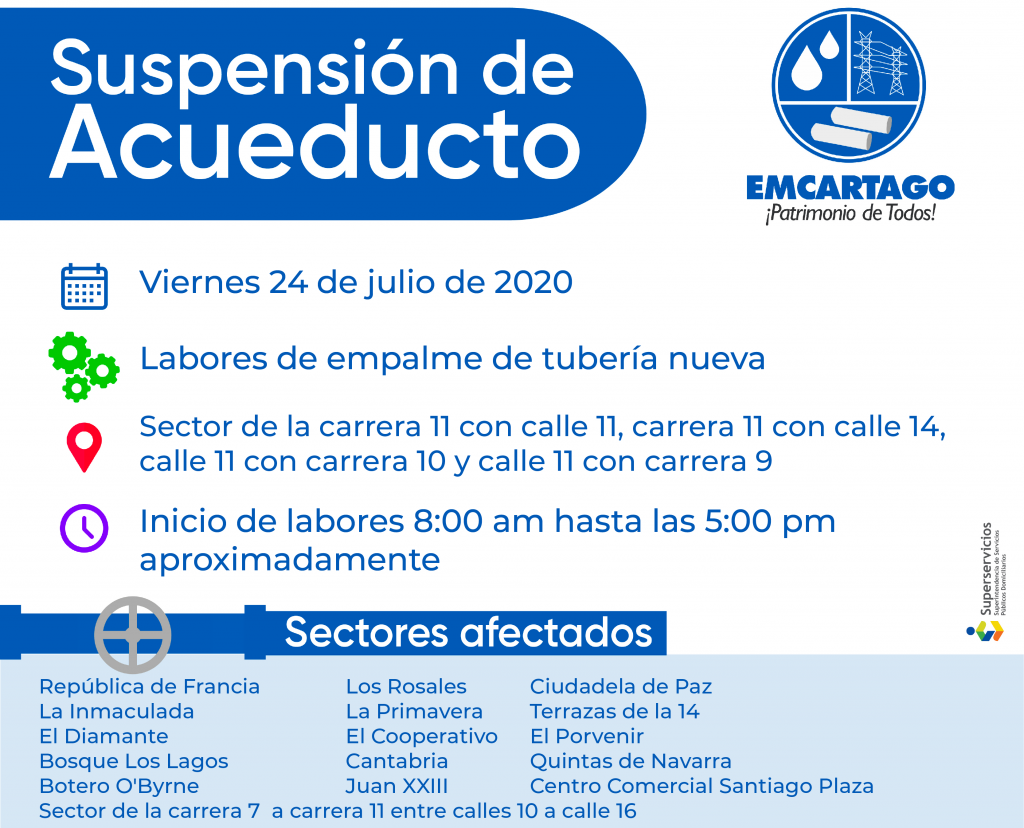 9 septiembre, 2020Publicado por Publicador Noticias EMC en 9 septiembre, 2020Categorías Boletines Suspensiones de Acueducto Suspensiones del ServicioSUSPENSIÓN DE ACUEDUCTO JUEVES 10 DE SEPTIEMBRE DE 2020Por labores de empalme de nueva tubería programadas en el sector de la Carrera 15 con Calle 7 […]