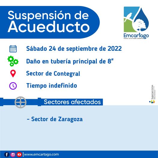 24 septiembre, 2022Publicado por Publicador Noticias EMC en 24 septiembre, 2022Categorías Boletines Cápsulas Informátivas Comunicados de PrensaSuspensión de AcueductoDaño en tubería principal de 8″ cerca al sector de Contegral en la vía a Zaragoza.