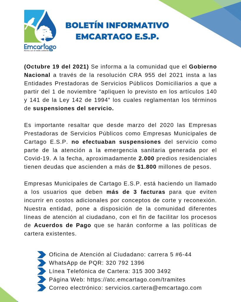 28 septiembre, 2022Publicado por Enlaza en 28 septiembre, 2022Categorías Boletines Cápsulas InformátivasBoletín Informativo#Emcartago invita a los usuarios que deben más de 3 facturas de servicios públicos para que se pongan […]