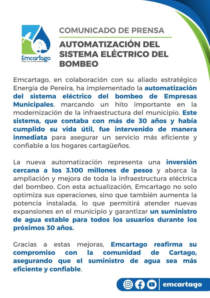 COMUNICADO DE PRENSA AUTOMATIZACIÓN DEL SISTEMA ELÉCTRICO DEL BOMBEO Emcartago, en colaboración con su aliado estratégico Energía de […]