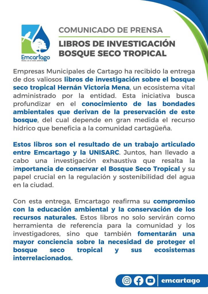 COMUNICADO DE PRENSA Libros de investigación: Bosque Seco Tropical Empresas Municipales de Cartago ha recibido la entrega de […]