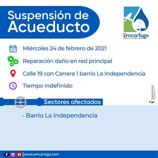 24 febrero, 2021Publicado por Enlaza en 24 febrero, 2021Categorías Boletines Suspensiones de Acueducto Suspensiones del ServicioSUSPENSION ACUEDUCTOSuspensión del servicio de acueducto, debido a daño en red principal del barrio La Independencia. Estos son los […]