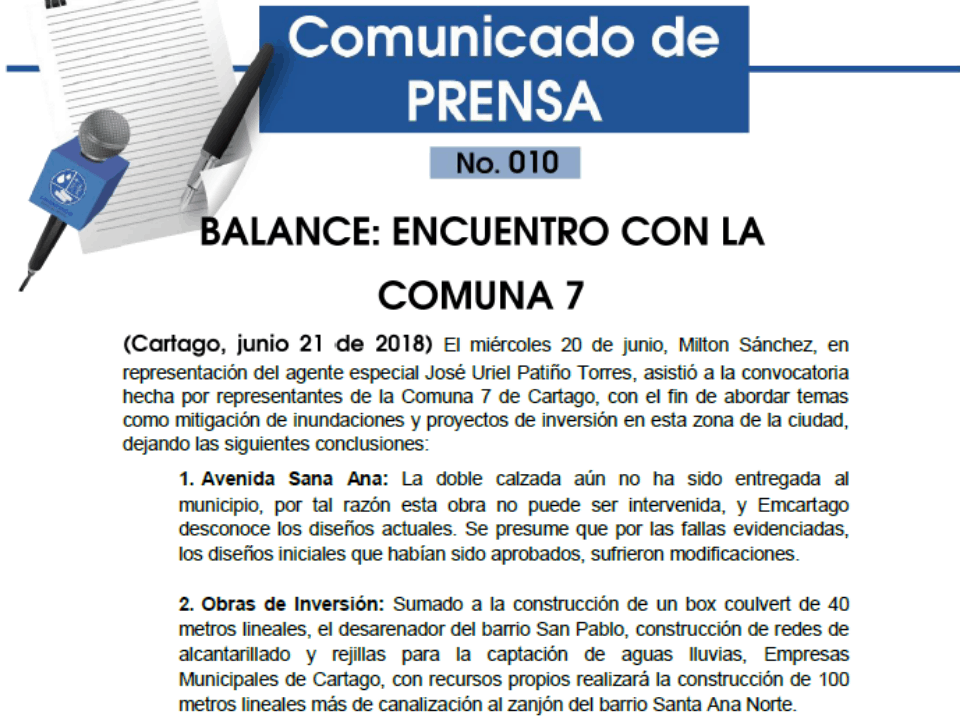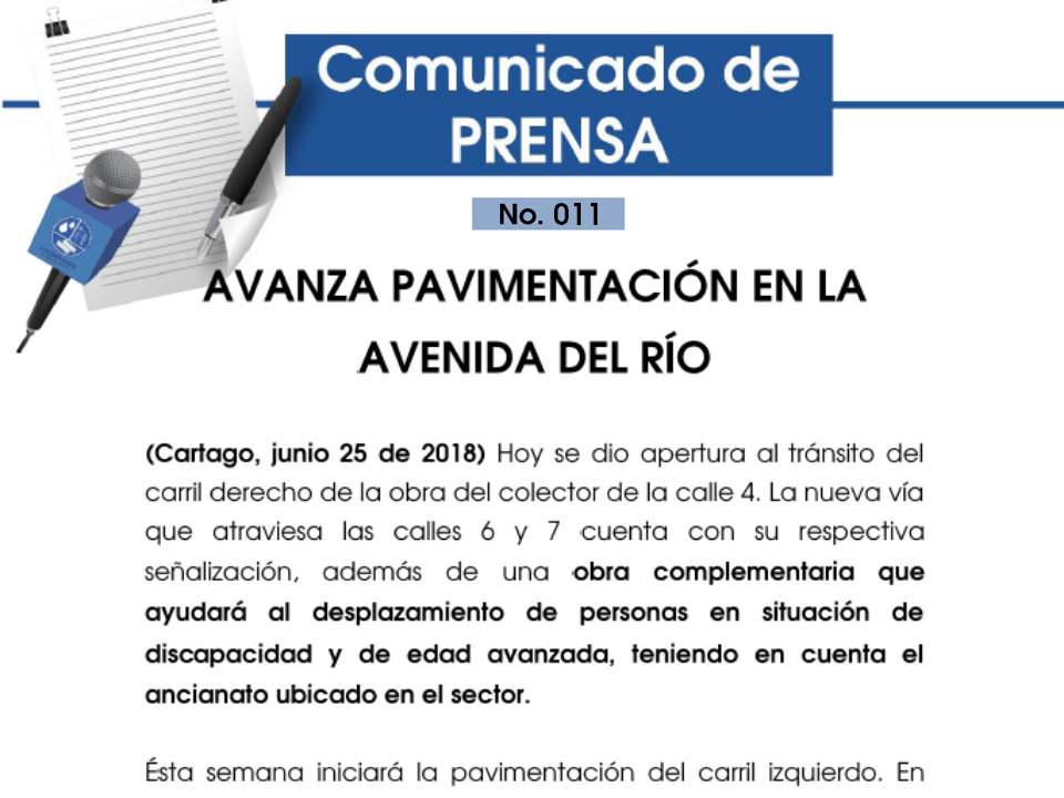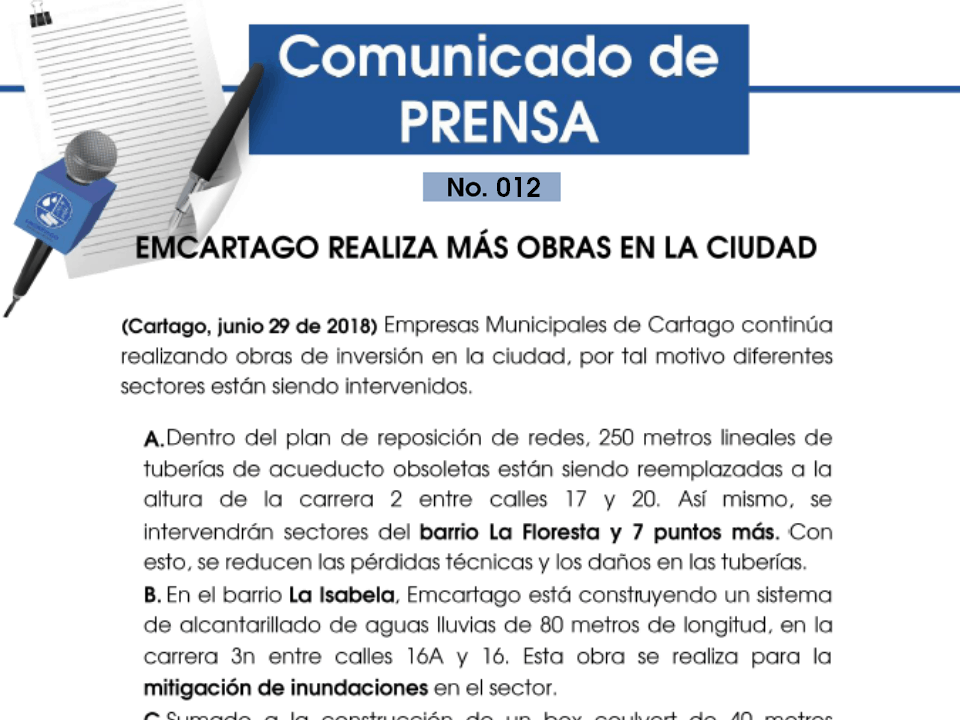 29 junio, 2018Publicado por Publicador Noticias EMC en 29 junio, 2018Categorías Comunicados de PrensaBOLETÍN N° 012 – 29 de junio de 2018.EMCARTAGO REALIZA MÁS OBRAS EN LA CIUDAD Empresas Municipales de Cartago continúa realizando obras de inversión en la […]