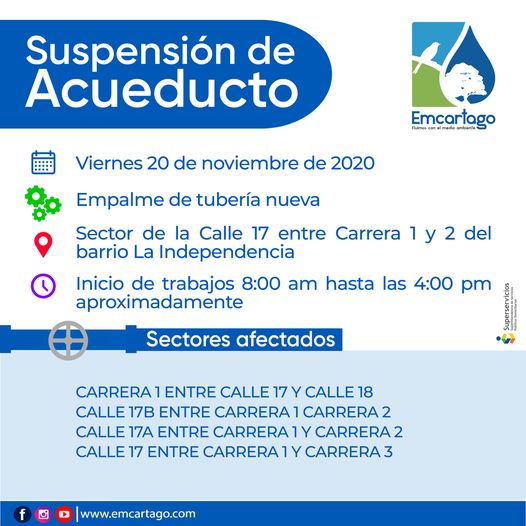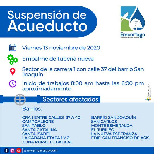 12 noviembre, 2020Publicado por Enlaza en 12 noviembre, 2020Categorías Boletines Suspensiones de Acueducto Suspensiones del ServicioSUSPENSION ACUEDUCTOSuspensión del servicio de acueducto este viernes 13 de noviembre a partir de las 8:00 a.m. hasta las […]