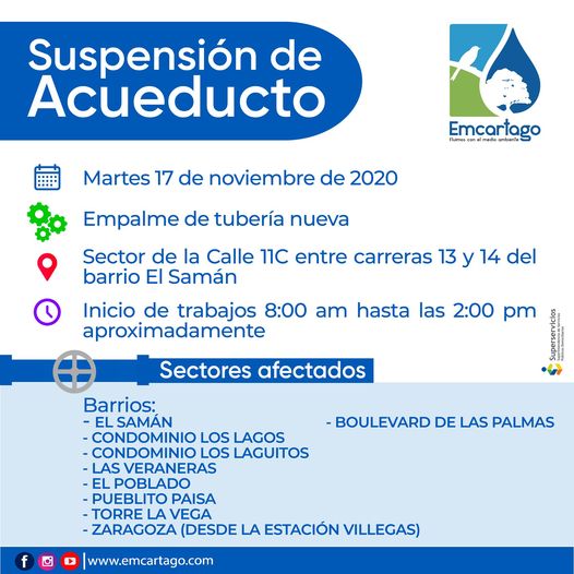 16 noviembre, 2020Publicado por Enlaza en 16 noviembre, 2020Categorías Boletines Suspensiones de Acueducto Suspensiones del ServicioSUSPENSION ACUEDUCTOSuspensión de acueducto para este martes 17 de noviembre a partir de las 8:00 am hasta las 2:00 […]