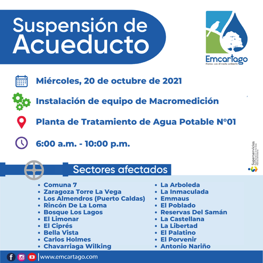 6 octubre, 2021Publicado por Enlaza en 6 octubre, 2021Categorías Boletines Suspensiones de Acueducto Suspensiones del ServicioSUSPENSION ACUEDUCTOPara efectuar la reparación de tubería de acueducto, es necesario suspender el servicio en el barrio La Inmaculada […]