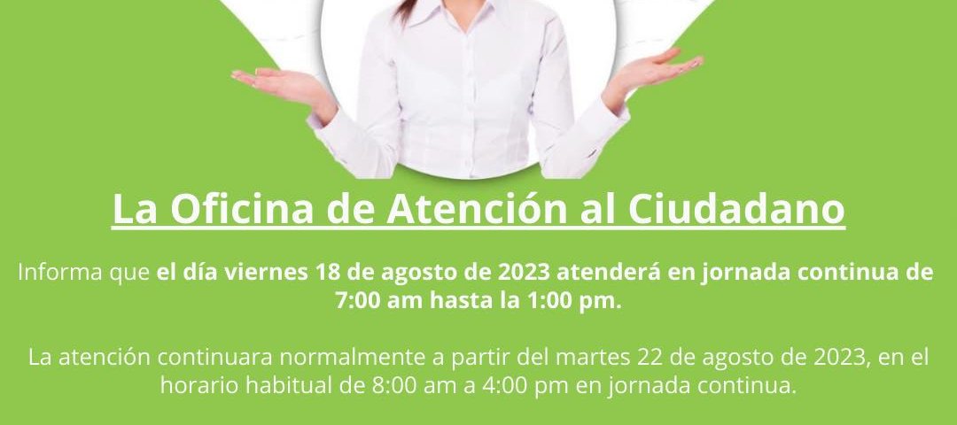 Nuestra oficina de atención al ciudadano atenderá en jornada continua el viernes 18 de agosto de 7:00 a.m. a 1:00 p.m. ![]()