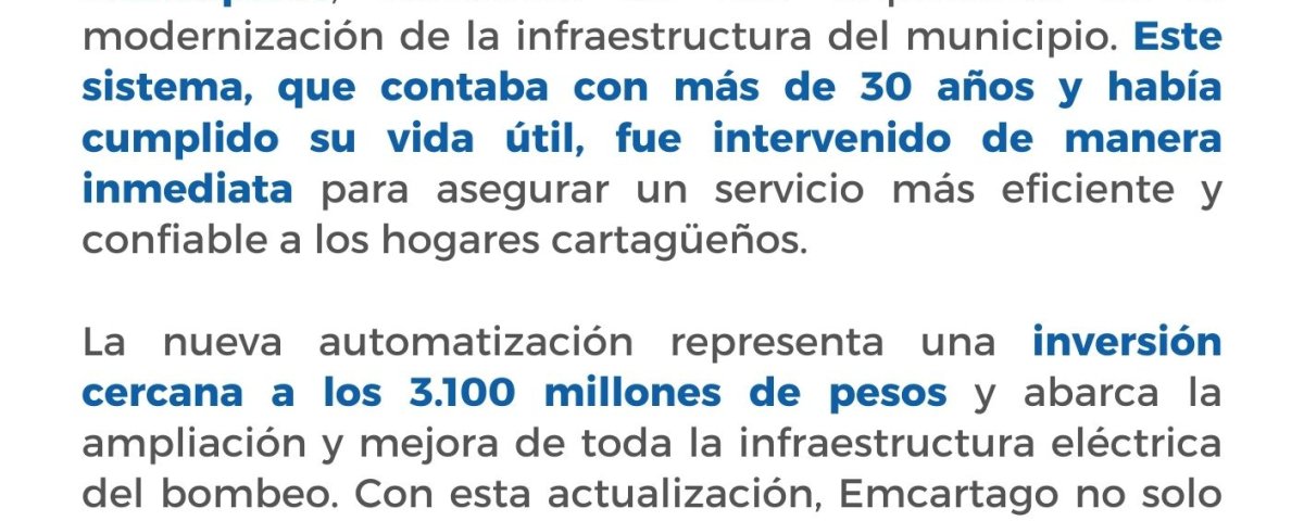 La nueva automatización representa una inversión cercana a los 3.100 millones de pesos y abarca la ampliación y mejora de toda la infraestructura eléctrica del bombeo. Con esta actualización, Emcartago no solo optimiza sus operaciones, sino que también aumenta la potencia instalada, lo que permitirá atender nuevas expansiones en el municipio y garantizar un suministro de agua estable para todos los usuarios durante los próximos 30 años.