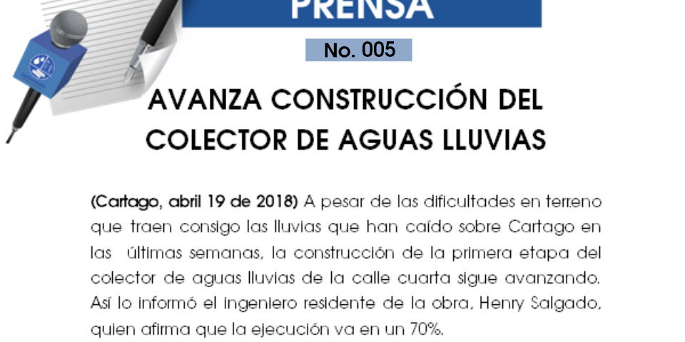 A pesar de las dificultades en terreno que traen consigo las lluvias que han caído sobre Cartago en las últimas semanas, la construcción de la primera etapa del colector de aguas lluvias de la calle cuarta sigue avanzando. Así lo informó el ingeniero residente de la obra, Henry Salgado, quien afirma que la ejecución va en un 70%.