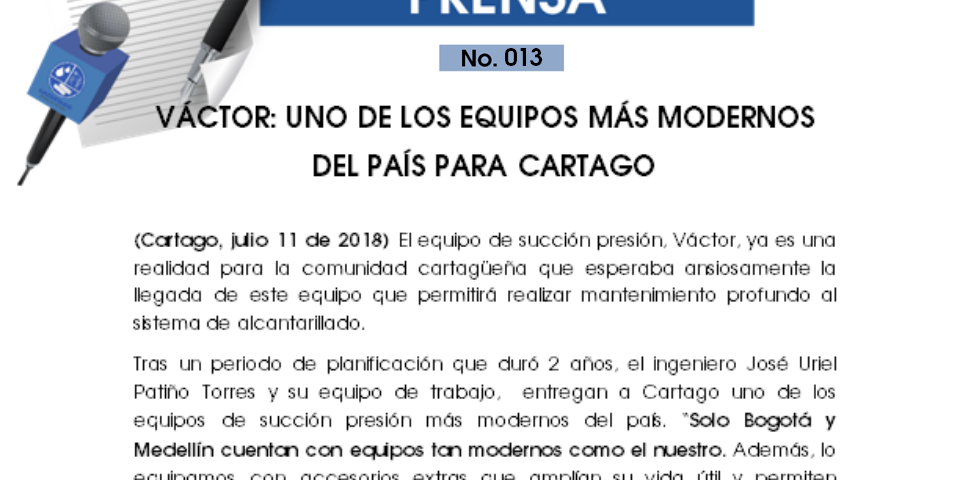 Tras un periodo de planificación que duró 2 años, el ingeniero José Uriel Patiño Torres y su equipo de trabajo,  entregan a Cartago uno de los equipos de succión presión más modernos del país. “Solo Bogotá y Medellín cuentan con equipos tan modernos como el nuestro. Además, lo equipamos con accesorios extras que amplían su vida útil y permiten incluso, aprovecharlo como carro de bomberos” indicó José Uriel Patiño Torres, Agente Especial de Emcartago,