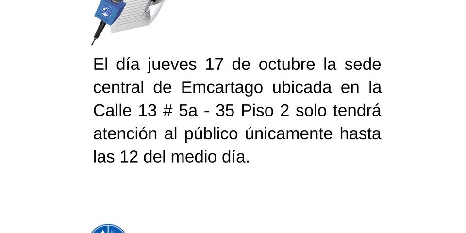 El día jueves 17 de octubre de 2019 la sede central de Emcartago, ubicada en la Calle 13 # 5a – 35 Piso 2 solo tendrá atención al público únicamente hasta las 12 del medio día.
