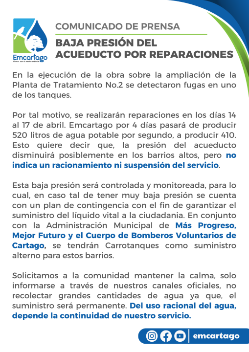 BAJA PRESIÓN DEL ACUEDUCTO POR REPARACIONES