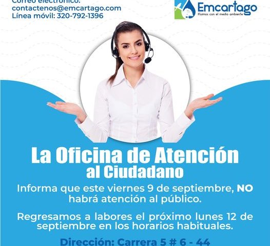 Suspension de Acueducto7 septiembre, 2022BASURAS OBSTRUYEN CAMARAS Y GENERAN MALOS OLORES9 septiembre, 2022 Informacion importante Oficina Atención al Ciudadano Publicado por Publicador Noticias EMC en 8 septiembre, 2022 Categorías Boletines Cápsulas Informátivas Comunicados de Prensa Tags Post Relacionados1 agosto, 2025ACCIONES PREVENTIVAS FENOMENO DEL NIÑOLeer Más1 agosto, 2025AMPLIACIÓN PLANTA DE TRATAMIENTO NO. 2Leer Más1 agosto, 2025BAJA PRESIÓN DEL ACUEDUCTO POR REPARACIONESLeer Más Deja una respuesta Cancelar la respuestaTu dirección de correo electrónico no será publicada. Los campos obligatorios están marcados con *Comentario * Nombre Correo electrónico Web Guarda mi nombre, correo electrónico y web en este navegador para la próxima vez que comente. Δ