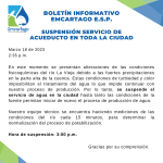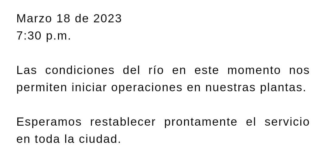 SUSPENSIÓN DEL SERVICIO24 agosto, 2023FELIZ DÍA DEL HOMBRE24 agosto, 2023 SERVICIO DE ACUEDUCTO Publicado por Publicador Noticias EMC en 24 agosto, 2023 Categorías Boletines Comunicados de Prensa Tags #Reporte INICIAMOS OPERACIONES EN NUESTRAS PLANTAS. Post Relacionados1 agosto, 2025ACCIONES PREVENTIVAS FENOMENO DEL NIÑOLeer Más1 agosto, 2025AMPLIACIÓN PLANTA DE TRATAMIENTO NO. 2Leer Más1 agosto, 2025BAJA PRESIÓN DEL ACUEDUCTO POR REPARACIONESLeer Más Deja una respuesta Cancelar la respuestaTu dirección de correo electrónico no será publicada. Los campos obligatorios están marcados con *Comentario * Nombre Correo electrónico Web Guarda mi nombre, correo electrónico y web en este navegador para la próxima vez que comente. Δ