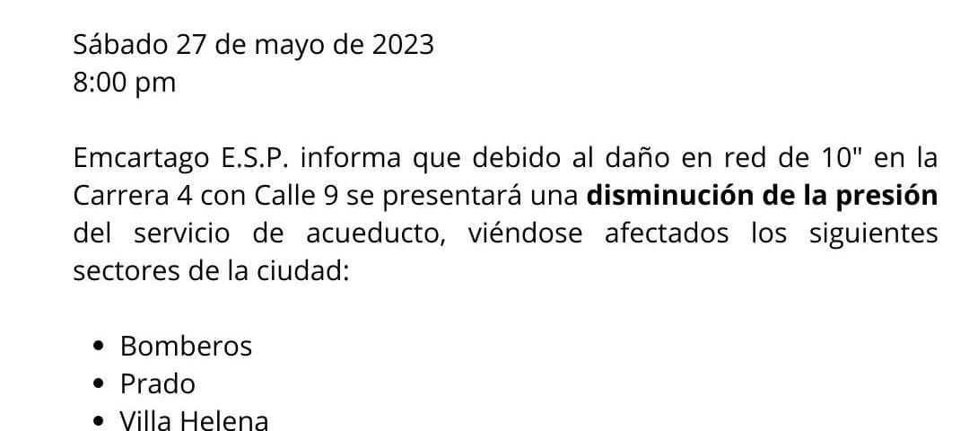 ATENCIÓN AL CIUDADANO7 septiembre, 2023SUSPENSIÓN DE ACUEDUCTO7 septiembre, 2023 SITUACIÓN SERVICIO DE ACUEDUCTO Publicado por Publicador Noticias EMC en 7 septiembre, 2023 Categorías Boletines Comunicados de Prensa Tags #Reporte SITUACIÓN SERVICIO DE ACUEDUCTO. Post Relacionados1 agosto, 2025ACCIONES PREVENTIVAS FENOMENO DEL NIÑOLeer Más1 agosto, 2025AMPLIACIÓN PLANTA DE TRATAMIENTO NO. 2Leer Más1 agosto, 2025BAJA PRESIÓN DEL ACUEDUCTO POR REPARACIONESLeer Más Deja una respuesta Cancelar la respuestaTu dirección de correo electrónico no será publicada. Los campos obligatorios están marcados con *Comentario * Nombre Correo electrónico Web Guarda mi nombre, correo electrónico y web en este navegador para la próxima vez que comente. Δ