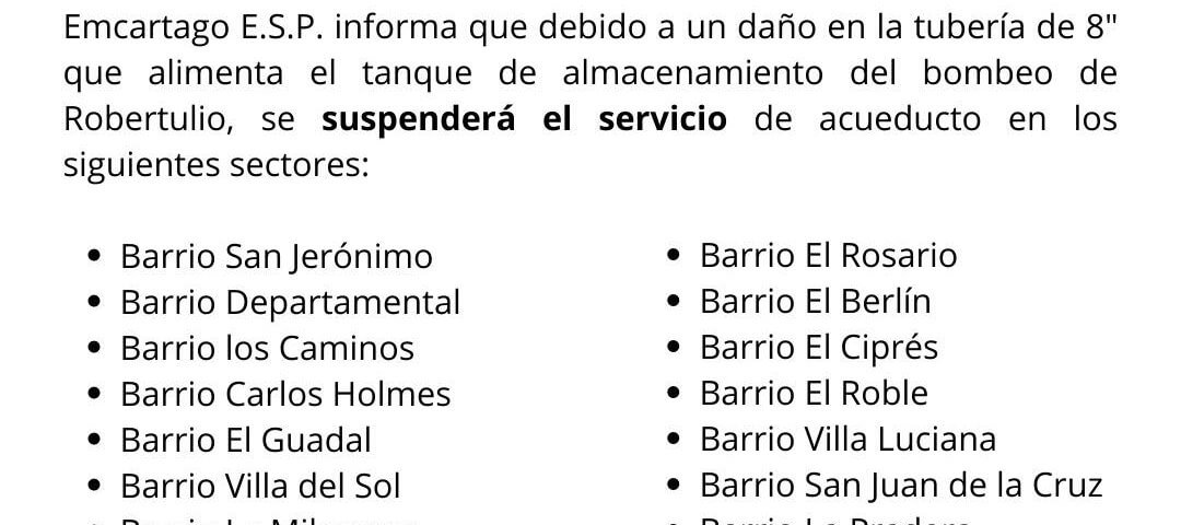 CULTURA CIUDADANA, SUMIDEROS OBSTRUIDO7 septiembre, 2023PROYECTO RECUPERACIÓN DE SUMIDEROS7 septiembre, 2023 SUSPENSIÓN DE ACUEDUCTO Publicado por Publicador Noticias EMC en 7 septiembre, 2023 Categorías Boletines Comunicados de Prensa Tags #SuspensionDeAcueducto Post Relacionados1 agosto, 2025ACCIONES PREVENTIVAS FENOMENO DEL NIÑOLeer Más1 agosto, 2025AMPLIACIÓN PLANTA DE TRATAMIENTO NO. 2Leer Más1 agosto, 2025BAJA PRESIÓN DEL ACUEDUCTO POR REPARACIONESLeer Más Deja una respuesta Cancelar la respuestaTu dirección de correo electrónico no será publicada. Los campos obligatorios están marcados con *Comentario * Nombre Correo electrónico Web Guarda mi nombre, correo electrónico y web en este navegador para la próxima vez que comente. Δ
