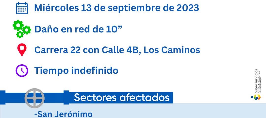 INDEPENDIZACIÓN DE ACOMETIDA27 septiembre, 2023REPARACIÓN DE DAÑO EN RED PRINCIPAL27 septiembre, 2023 SUSPENSIÓN DE ACUEDUCTO Publicado por Publicador Noticias EMC en 27 septiembre, 2023 Categorías ATENCIÓN AL CLIENTE Comunicados de Prensa Tags #SuspensiónDeAcueducto Post Relacionados1 agosto, 2025ACCIONES PREVENTIVAS FENOMENO DEL NIÑOLeer Más1 agosto, 2025AMPLIACIÓN PLANTA DE TRATAMIENTO NO. 2Leer Más1 agosto, 2025BAJA PRESIÓN DEL ACUEDUCTO POR REPARACIONESLeer Más Deja una respuesta Cancelar la respuestaTu dirección de correo electrónico no será publicada. Los campos obligatorios están marcados con *Comentario * Nombre Correo electrónico Web Guarda mi nombre, correo electrónico y web en este navegador para la próxima vez que comente. Δ