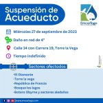 SUSPENSIÓN DE ACUEDUCTO27 septiembre, 2023LIMPIEZA DE RED CON EL EQUIPO VACTOR9 octubre, 2023 SUSPENSIÓN DE ACUEDUCTO Publicado por Publicador Noticias EMC en 9 octubre, 2023 Categorías ATENCIÓN AL CLIENTE Comunicados de Prensa Tags #SuspensiónDeAcueducto Post Relacionados1 agosto, 2025ACCIONES PREVENTIVAS FENOMENO DEL NIÑOLeer Más1 agosto, 2025AMPLIACIÓN PLANTA DE TRATAMIENTO NO. 2Leer Más1 agosto, 2025BAJA PRESIÓN DEL ACUEDUCTO POR REPARACIONESLeer Más Deja una respuesta Cancelar la respuestaTu dirección de correo electrónico no será publicada. Los campos obligatorios están marcados con *Comentario * Nombre Correo electrónico Web Guarda mi nombre, correo electrónico y web en este navegador para la próxima vez que comente. Δ