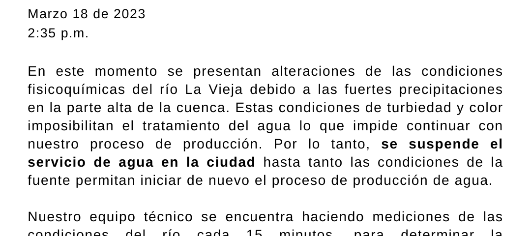 VISITA A LA EMPRESA DE SERVICIOS PÚBLICOS DE MANIZALES24 agosto, 2023SERVICIO DE ACUEDUCTO24 agosto, 2023 SUSPENSIÓN DEL SERVICIO Publicado por Publicador Noticias EMC en 24 agosto, 2023 Categorías Boletines Comunicados de Prensa Tags #Atención SUSPENSIÓN DEL SERVICIO DE ACUEDUCTO EN TODA LA CIUDAD, DEBIDO A ALTAS TURBIEDADES. Post Relacionados1 agosto, 2025ACCIONES PREVENTIVAS FENOMENO DEL NIÑOLeer Más1 agosto, 2025AMPLIACIÓN PLANTA DE TRATAMIENTO NO. 2Leer Más1 agosto, 2025BAJA PRESIÓN DEL ACUEDUCTO POR REPARACIONESLeer Más Deja una respuesta Cancelar la respuestaTu dirección de correo electrónico no será publicada. Los campos obligatorios están marcados con *Comentario * Nombre Correo electrónico Web Guarda mi nombre, correo electrónico y web en este navegador para la próxima vez que comente. Δ
