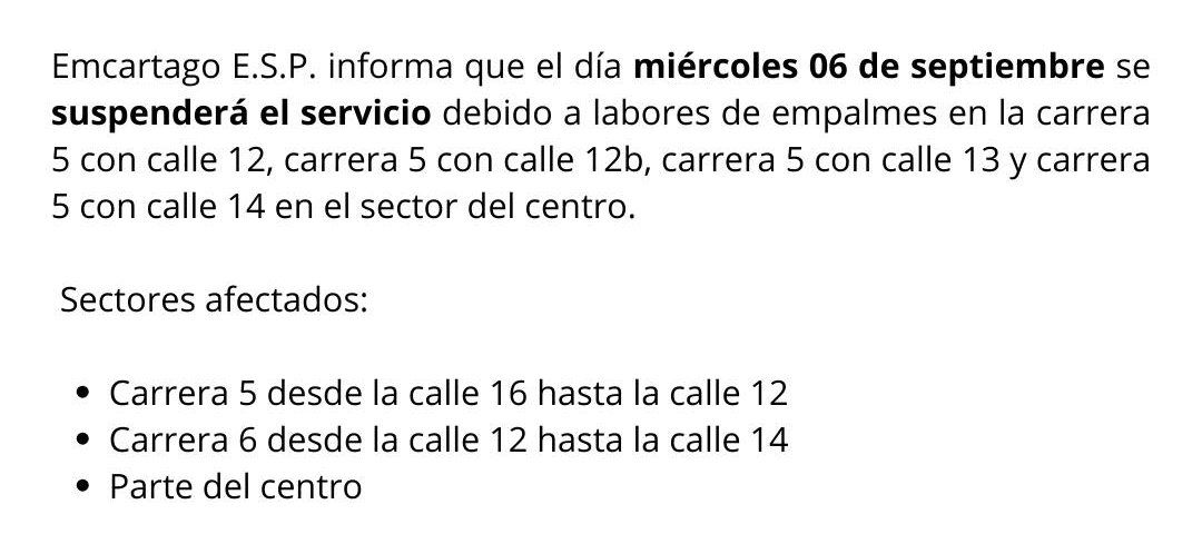 ACOMPAÑAMIENTO COMITÉ TÉCNICO DE AVANCE DE OBRA TERMINAL DE TRANSPORTE27 septiembre, 2023REPOSICIÓN TOTAL DE ACOMETIDA27 septiembre, 2023 SUSPENSIÓN PROGRAMADA Publicado por Publicador Noticias EMC en 27 septiembre, 2023 Categorías ATENCIÓN AL CLIENTE Comunicados de Prensa Tags Post Relacionados1 agosto, 2025ACCIONES PREVENTIVAS FENOMENO DEL NIÑOLeer Más1 agosto, 2025AMPLIACIÓN PLANTA DE TRATAMIENTO NO. 2Leer Más1 agosto, 2025BAJA PRESIÓN DEL ACUEDUCTO POR REPARACIONESLeer Más Deja una respuesta Cancelar la respuestaTu dirección de correo electrónico no será publicada. Los campos obligatorios están marcados con *Comentario * Nombre Correo electrónico Web Guarda mi nombre, correo electrónico y web en este navegador para la próxima vez que comente. Δ