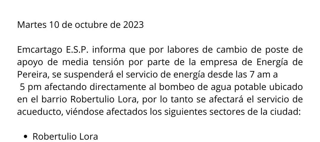 Emcartago E.S.P. informa que mañana 11 de octubre de 2023 por labores de cambio de poste de apoyo de media tensión por parte de la empresa de Energía de Pereira, se afectará el servicio de acueducto, viéndose afectado el barrio Robertulio Lora.