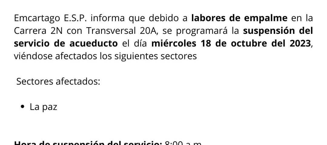 ATENCIÓN AL CIUDADANO5 diciembre, 2023SUSPENSIÓN PROGRAMADA5 diciembre, 2023 SUSPENSIÓN PROGRAMADA Publicado por Publicador Noticias EMC en 5 diciembre, 2023 Categorías ATENCIÓN AL CLIENTE Cápsulas Informátivas Comunicados de Prensa Tags #SuspensiónProgramada Post Relacionados1 agosto, 2025ACCIONES PREVENTIVAS FENOMENO DEL NIÑOLeer Más1 agosto, 2025AMPLIACIÓN PLANTA DE TRATAMIENTO NO. 2Leer Más1 agosto, 2025BAJA PRESIÓN DEL ACUEDUCTO POR REPARACIONESLeer Más Deja una respuesta Cancelar la respuestaTu dirección de correo electrónico no será publicada. Los campos obligatorios están marcados con *Comentario * Nombre Correo electrónico Web Guarda mi nombre, correo electrónico y web en este navegador para la próxima vez que comente. Δ