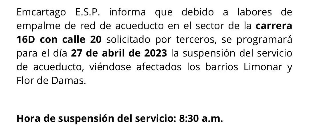 LIMPIEZA DE SUMIDEROS30 agosto, 2023REHABILITACIÓN DE REJILLA30 agosto, 2023 SUSPENSIÓN PROGRAMADA Publicado por Publicador Noticias EMC en 30 agosto, 2023 Categorías Boletines Comunicados de Prensa Tags #Atención #SuspensiónProgramada Post Relacionados1 agosto, 2025ACCIONES PREVENTIVAS FENOMENO DEL NIÑOLeer Más1 agosto, 2025AMPLIACIÓN PLANTA DE TRATAMIENTO NO. 2Leer Más1 agosto, 2025BAJA PRESIÓN DEL ACUEDUCTO POR REPARACIONESLeer Más Deja una respuesta Cancelar la respuestaTu dirección de correo electrónico no será publicada. Los campos obligatorios están marcados con *Comentario * Nombre Correo electrónico Web Guarda mi nombre, correo electrónico y web en este navegador para la próxima vez que comente. Δ