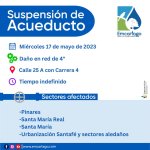MACROMEDICIÓN EN ESTACIÓN DE BOMBEO7 septiembre, 2023SUSPENSIÓN DE ACUEDCUTO7 septiembre, 2023 SUSPENSIÓN PROGRAMADA Publicado por Publicador Noticias EMC en 7 septiembre, 2023 Categorías Boletines Comunicados de Prensa Tags #Atención #SuspensiónDeAcueducto Post Relacionados1 agosto, 2025ACCIONES PREVENTIVAS FENOMENO DEL NIÑOLeer Más1 agosto, 2025AMPLIACIÓN PLANTA DE TRATAMIENTO NO. 2Leer Más1 agosto, 2025BAJA PRESIÓN DEL ACUEDUCTO POR REPARACIONESLeer Más Deja una respuesta Cancelar la respuestaTu dirección de correo electrónico no será publicada. Los campos obligatorios están marcados con *Comentario * Nombre Correo electrónico Web Guarda mi nombre, correo electrónico y web en este navegador para la próxima vez que comente. Δ