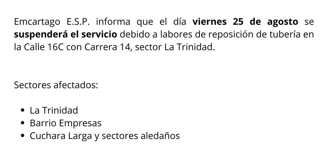 FELIZ CUMPLEAÑOS ALCALDE27 septiembre, 2023EQUIPO VACTOR27 septiembre, 2023 SUSPENSIÓN PROGRAMADA Publicado por Publicador Noticias EMC en 27 septiembre, 2023 Categorías ATENCIÓN AL CLIENTE Comunicados de Prensa Tags #SuspensiónProgramada Post Relacionados1 agosto, 2025ACCIONES PREVENTIVAS FENOMENO DEL NIÑOLeer Más1 agosto, 2025AMPLIACIÓN PLANTA DE TRATAMIENTO NO. 2Leer Más1 agosto, 2025BAJA PRESIÓN DEL ACUEDUCTO POR REPARACIONESLeer Más Deja una respuesta Cancelar la respuestaTu dirección de correo electrónico no será publicada. Los campos obligatorios están marcados con *Comentario * Nombre Correo electrónico Web Guarda mi nombre, correo electrónico y web en este navegador para la próxima vez que comente. Δ