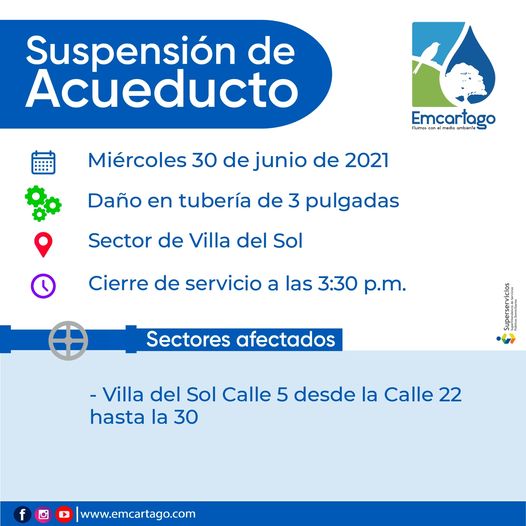Suspensión del servicio de acueducto por daño en el sector de Villa del Sol. Estos son los sectores […]