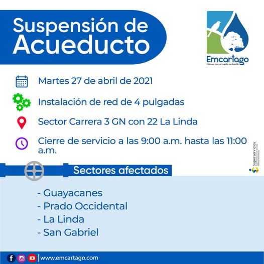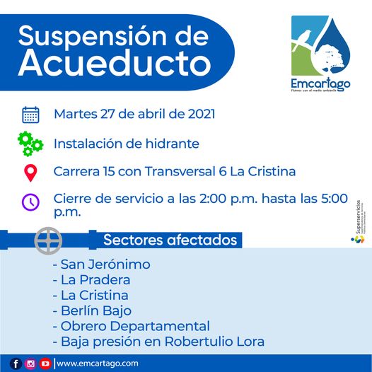 Suspensión del servicio de acueducto este martes 27 de abril a partir de las 9:00 a.m., debido a […]