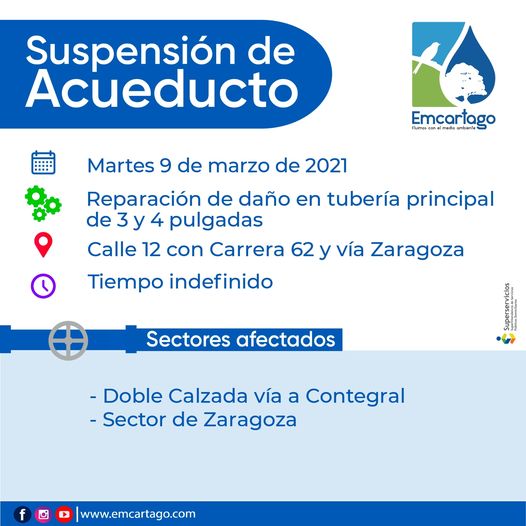 Suspensión del servicio de acueducto debido a daño en tubería de 3 y 4 pulgadas en el sector […]