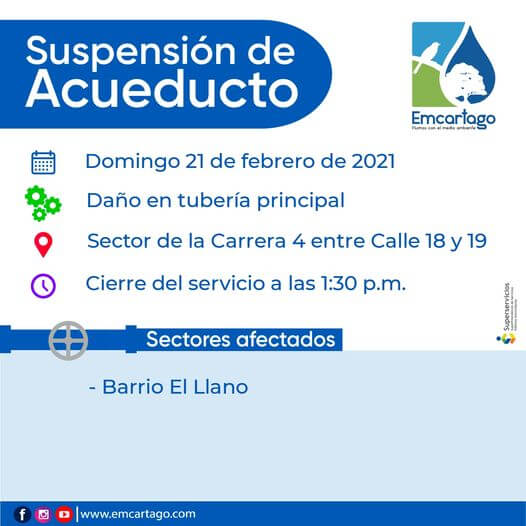 Suspensión del servicio de acueducto, debido a daño en la red de 3 pulgadas de la Calle 4 […]