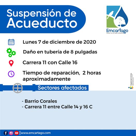 Suspensión del servicio de acueducto por daño en el sector de la Carrera 11 con Calle 16. Estos […]