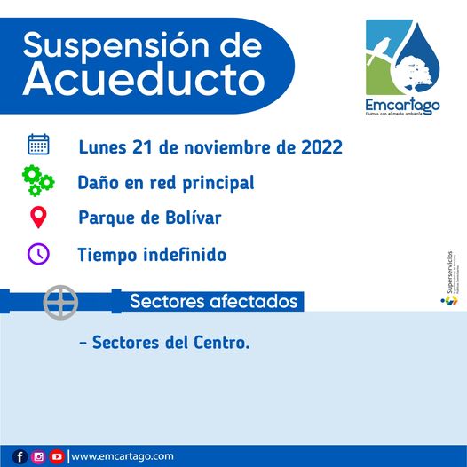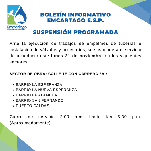 Este lunes 21 de noviembre, habrá suspensión del servicio de acueducto en los siguientes sectores, debido a labores […]