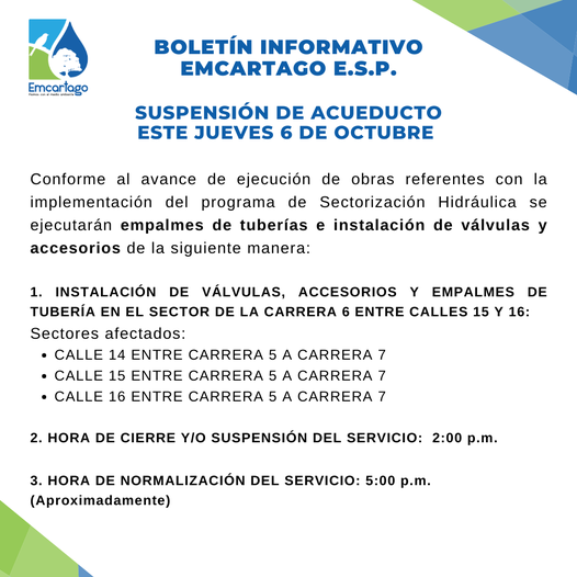 Suspensión de acueducto programada Debido a labores de empalme de tubería nueva en la obra de la Carrera […]