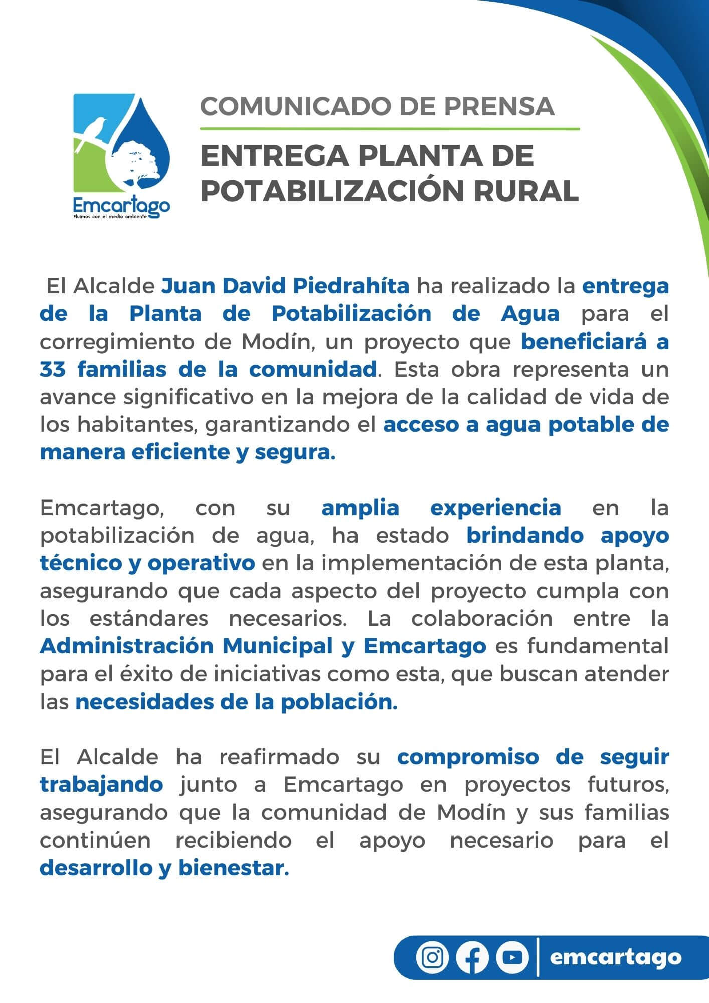 COMUNICADO PRENSA  ENTREGA PLANTA DE POTABILIZACIÓN RURAL