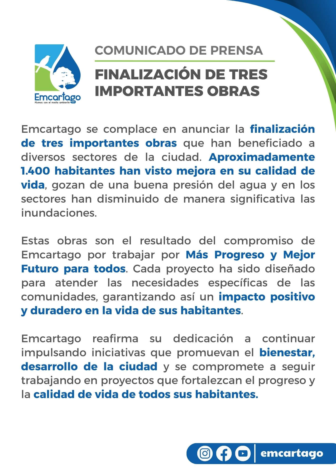 COMUNICADO DE PRENSA FINALIZACIÓN DE TRES OBRAS IMPORTANTES
