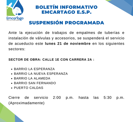 Este lunes 21 de noviembre, habrá suspensión del servicio de acueducto en los siguientes sectores, debido a labores de empalme e instalación de válvulas y accesorios.
