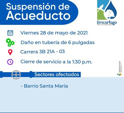 EMCARTAGO CON LA COMUNIDAD27 mayo, 2021EMCARTAGO CONTIGO31 mayo, 2021 SUSPENSION ACUEDUCTO Publicado por Enlaza en 28 mayo, 2021 Categorías Sin categorizar Tags Suspensión del servicio de acueducto por daño en tubería de 6 pulgadas en la Carrera 3B 21A – 03. Estos son los sectores afectados. Post Relacionados1 agosto, 2025REPARACIÓN DE FUGAS EN LA PTAP NO. 2Leer Más1 agosto, 2025INVERSIONES PARA CARTAGOLeer Más1 agosto, 2025PARTICIPACIÓN PROGRESO EN TU BARRIOLeer Más Deja una respuesta Cancelar la respuestaTu dirección de correo electrónico no será publicada. Los campos obligatorios están marcados con *Comentario * Nombre Correo electrónico Web Guarda mi nombre, correo electrónico y web en este navegador para la próxima vez que comente. Δ